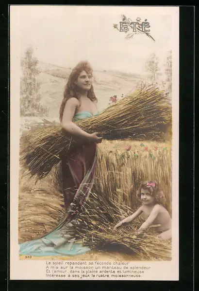 Künstler-AK Eté - Frau und Mädchen im Getreidefeld, Gedicht