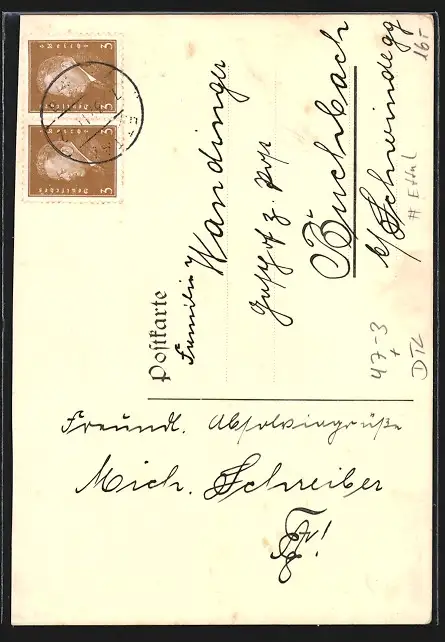 Personenbezogene Daten auf der Rückseite der Karte wurden durch blauen Textmarker unkenntlich gemacht. Die blauen Stellen sind auf die Vorderseite durchgeweicht und wirken sich negativ auf das Postkartenfoto aus