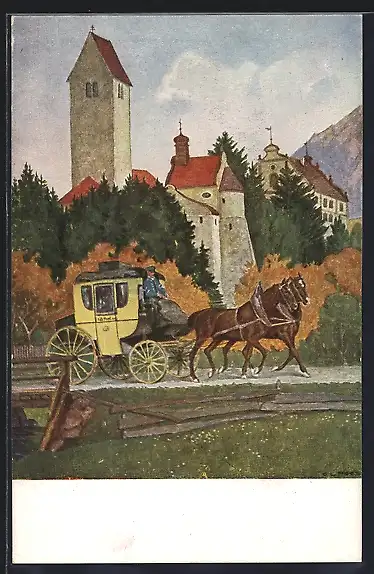 Künstler-AK Eug. L. Hoess: Postkutsche vor einer Ortschaft