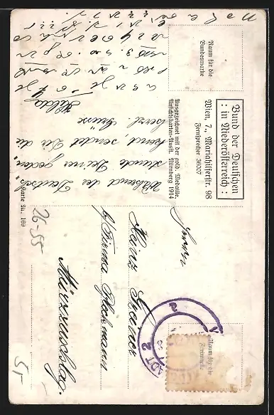 Personenbezogene Daten auf der Rückseite der Karte wurden durch blauen Textmarker unkenntlich gemacht. Die blauen Stellen sind auf die Vorderseite durchgeweicht und wirken sich negativ auf das Postkartenfoto aus