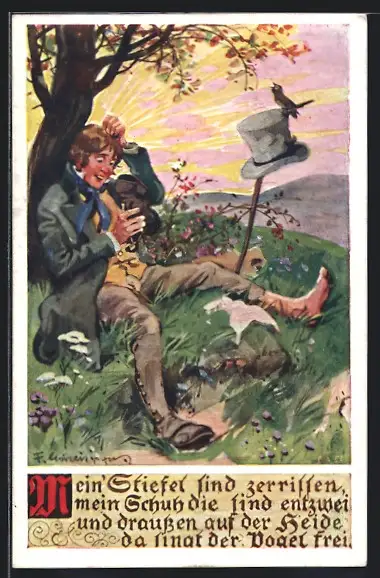 Künstler-AK F. Gareis: Mann mit zerrissenem Schuh
