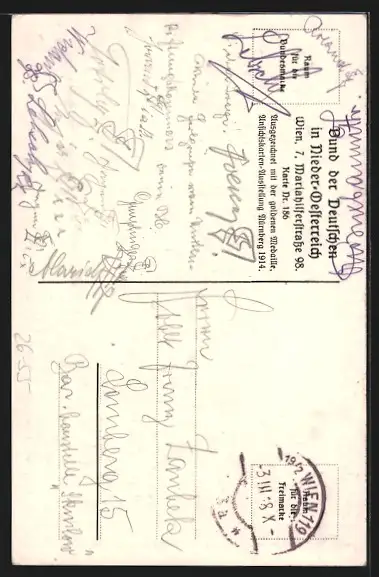 Personenbezogene Daten auf der Rückseite der Karte wurden durch blauen Textmarker unkenntlich gemacht. Die blauen Stellen sind auf die Vorderseite durchgeweicht und wirken sich negativ auf das Postkartenfoto aus