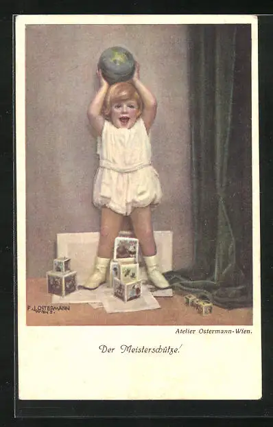 Künstler-AK F. J. Ostermann: Der Meisterschütze, Kleines Kind wirft einen Ball