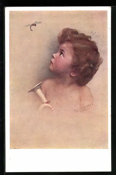 Künstler-AK F. J. Ostermann: Kindchen mit Horn guckt aufs Insekt