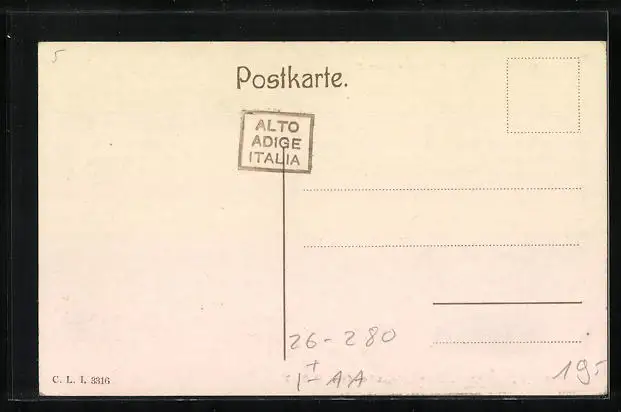 Personenbezogene Daten auf der Rückseite der Karte wurden durch blauen Textmarker unkenntlich gemacht. Die blauen Stellen sind auf die Vorderseite durchgeweicht und wirken sich negativ auf das Postkartenfoto aus