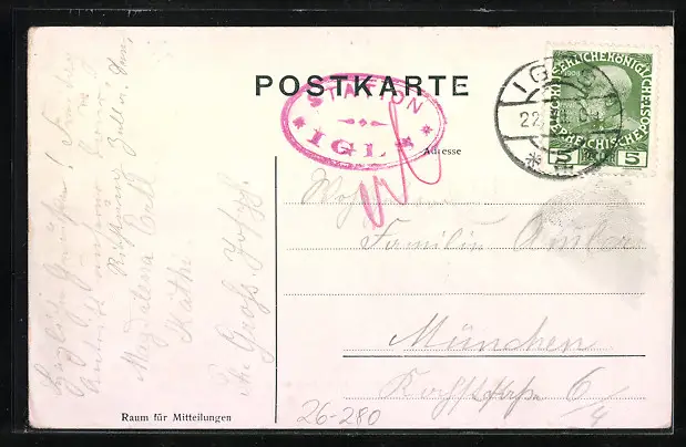 Personenbezogene Daten auf der Rückseite der Karte wurden durch blauen Textmarker unkenntlich gemacht. Die blauen Stellen sind auf die Vorderseite durchgeweicht und wirken sich negativ auf das Postkartenfoto aus