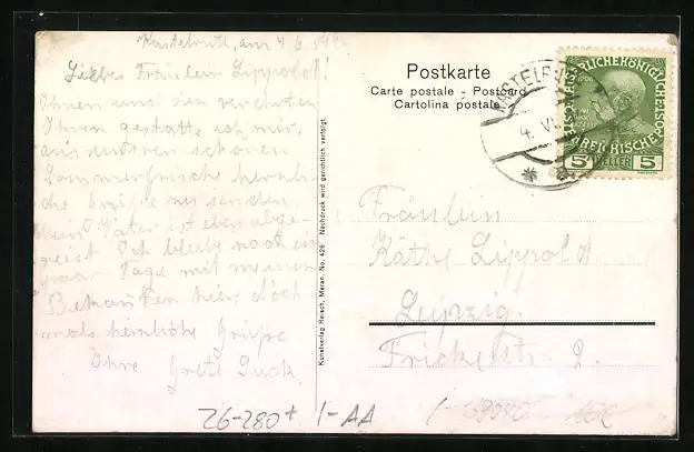 Personenbezogene Daten auf der Rückseite der Karte wurden durch blauen Textmarker unkenntlich gemacht. Die blauen Stellen sind auf die Vorderseite durchgeweicht und wirken sich negativ auf das Postkartenfoto aus