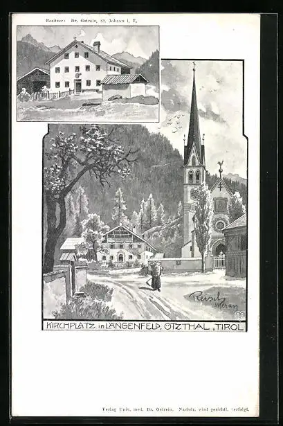 Künstler-AK F.A.C.M. Reisch: Längenfeld, Kirchplatz