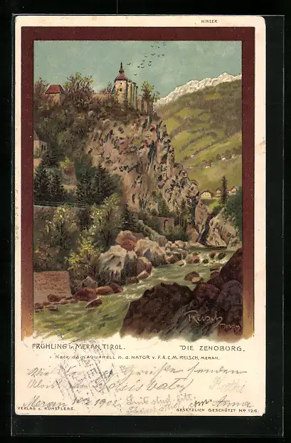 Künstler-AK F.A.C.M. Reisch: Meran, Die Zenoburg im Frühling