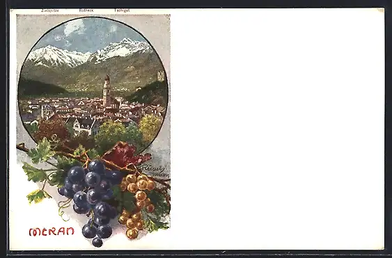 Künstler-AK F.A.C.M. Reisch: Meran, Gesamtansicht im Bergidyll, Weintrauben im Passepartout