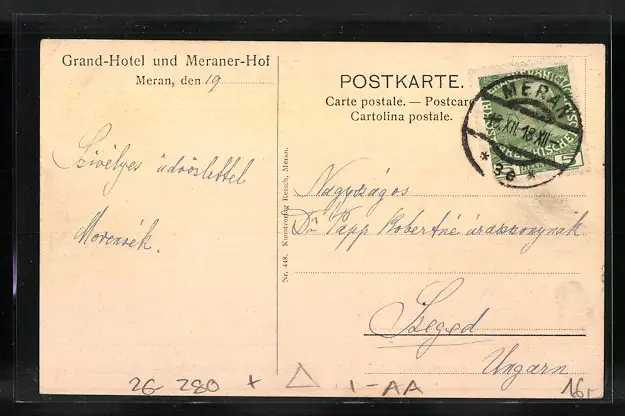 Künstler-AK F.A.C.M. Reisch: Meran, Grand-Hotel und Meraner-Hof mit Zielspitze, Rotheck, Tschigat