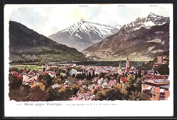 Künstler-AK F.A.C.M. Reisch: Meran, Panorama gegen Vinschgau