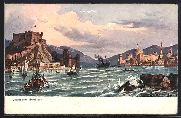 Künstler-AK F.Perlberg: Dardanellen-Schlösser, Segler, Dampfer