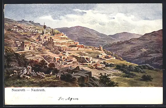 Künstler-AK F.Perlberg: Nazareth, arabischer Schäfer mit Schafherde am Stadtrand