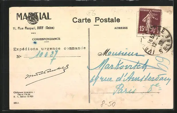 Personenbezogene Daten auf der Rückseite der Karte wurden durch blauen Textmarker unkenntlich gemacht. Die blauen Stellen sind auf die Vorderseite durchgeweicht und wirken sich negativ auf das Postkartenfoto aus