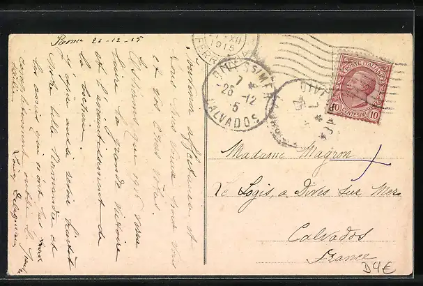 Personenbezogene Daten auf der Rückseite der Karte wurden durch blauen Textmarker unkenntlich gemacht. Die blauen Stellen sind auf die Vorderseite durchgeweicht und wirken sich negativ auf das Postkartenfoto aus