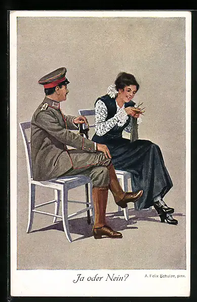 Künstler-AK Felix Schulze: Ja oder Nein?, Soldat in Uniform flirtet mit seiner Liebsten