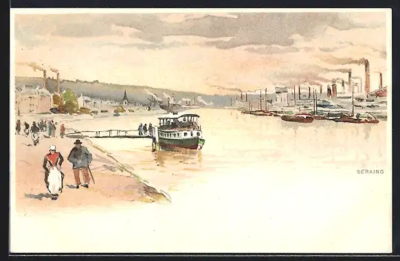Künstler-AK Ferdinand Coenraets: Seraing, Uferpartie mit Dampfer und Fabrikanlagen