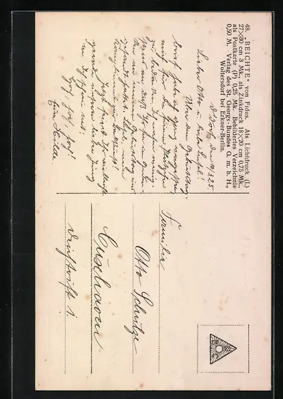 Personenbezogene Daten auf der Rückseite der Karte wurden durch blauen Textmarker unkenntlich gemacht. Die blauen Stellen sind auf die Vorderseite durchgeweicht und wirken sich negativ auf das Postkartenfoto aus