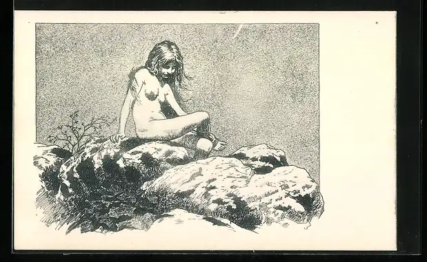 Künstler-AK Fidus: Nacktes Mädchen sitzt auf einem Felsen und erblickt eine kleine Eidechse
