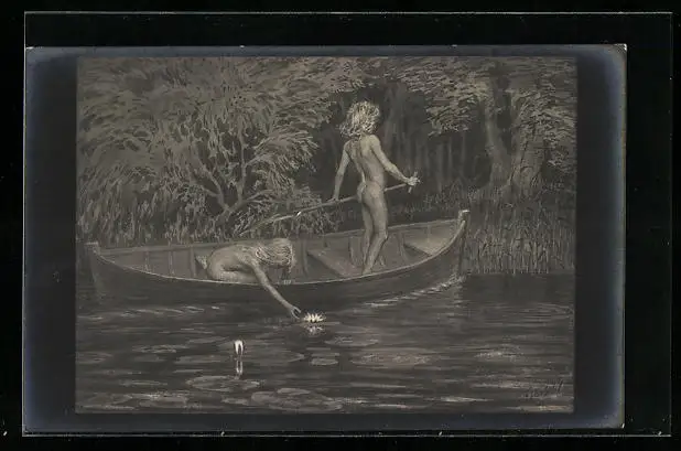 Künstler-AK Fidus: Wasserrosen, Uferpartie mit Figuren im Ruderboot