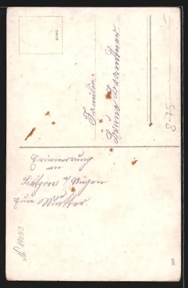 Personenbezogene Daten auf der Rückseite der Karte wurden durch blauen Textmarker unkenntlich gemacht. Die blauen Stellen sind auf die Vorderseite durchgeweicht und wirken sich negativ auf das Postkartenfoto aus
