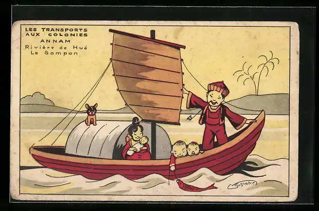 Künstler-AK Fischerboot, China, Chinesische Familie im Boot