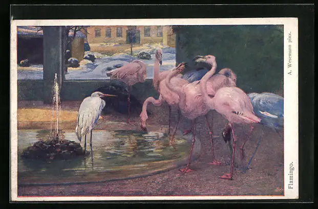 Künstler-AK Flamingos und ein Silberreiher an einem Springbrunnen