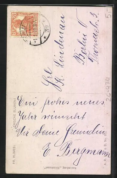Personenbezogene Daten auf der Rückseite der Karte wurden durch blauen Textmarker unkenntlich gemacht. Die blauen Stellen sind auf die Vorderseite durchgeweicht und wirken sich negativ auf das Postkartenfoto aus