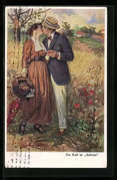 Künstler-AK Franz Doubek: Ein Kuss in Aehren, Liebespaar