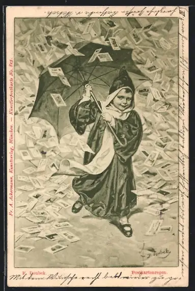Künstler-AK Franz Doubek: Postkarten regnen auf das Münchner Kindl nieder