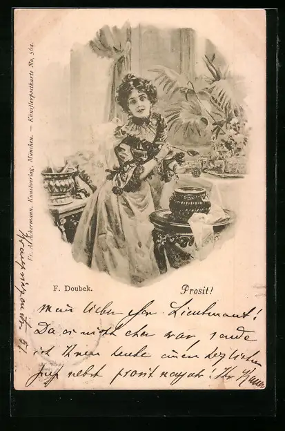 Künstler-AK Franz Doubek: Prosit!, Frau füllt sich Bowle in ein Glas