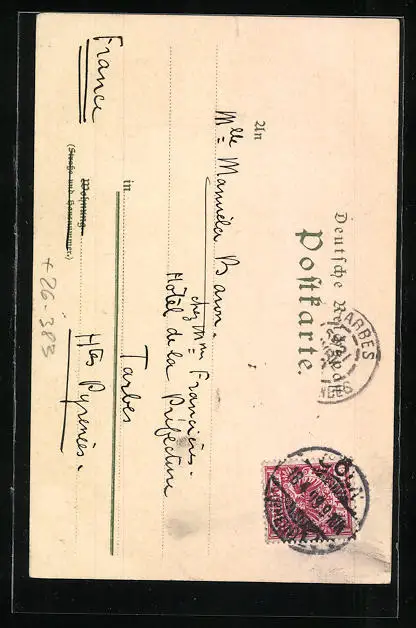 Personenbezogene Daten auf der Rückseite der Karte wurden durch blauen Textmarker unkenntlich gemacht. Die blauen Stellen sind auf die Vorderseite durchgeweicht und wirken sich negativ auf das Postkartenfoto aus