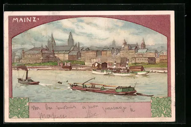 Künstler-AK Franz Hein: Mainz, Uferpartie mit Kirche und Booten