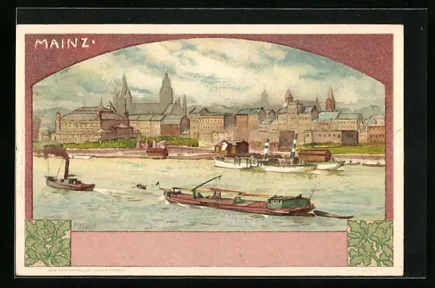 Künstler-AK Franz Hein: Mainz, Uferpartie mit Schiffen