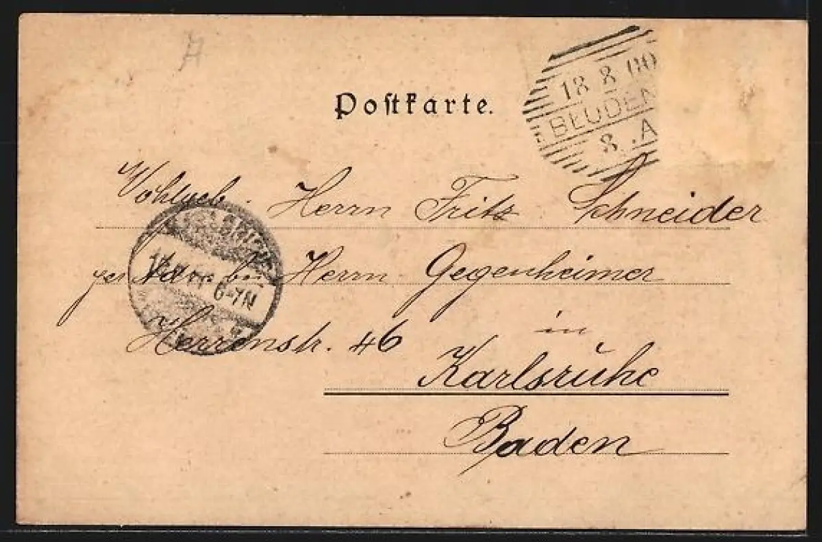 alte Ansichtskarte, gelaufen 1900, Briefmarke entfernt, rückseitig Oberflächenschaden, Eckknick li. unten, guter Zustand