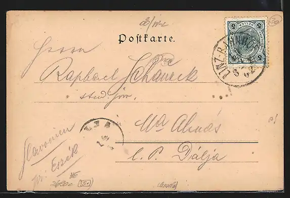 Personenbezogene Daten auf der Rückseite der Karte wurden durch blauen Textmarker unkenntlich gemacht. Die blauen Stellen sind auf die Vorderseite durchgeweicht und wirken sich negativ auf das Postkartenfoto aus