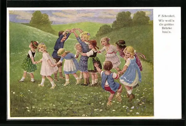 Künstler-AK Franziska Schenkel: Kinder tanzen auf einer Weide