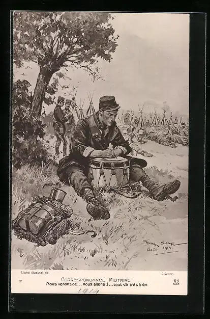 Künstler-AK Französischer Soldat schreibt auf der Trommel einen Feldpost-Brief