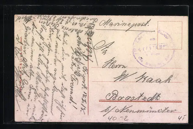 Personenbezogene Daten auf der Rückseite der Karte wurden durch blauen Textmarker unkenntlich gemacht. Die blauen Stellen sind auf die Vorderseite durchgeweicht und wirken sich negativ auf das Postkartenfoto aus