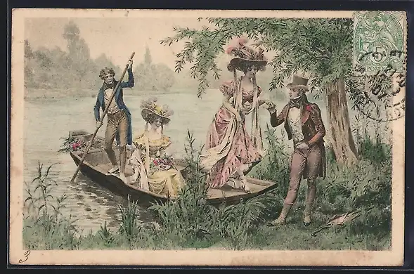 Künstler-AK Frau steight aus einem Boot ans Ufer