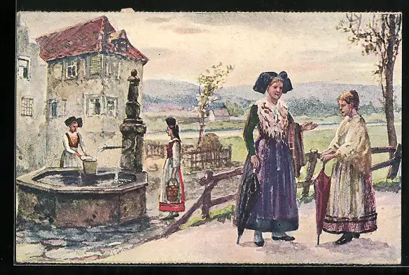 Künstler-AK Frauen in elsässer Trachten am Brunnen
