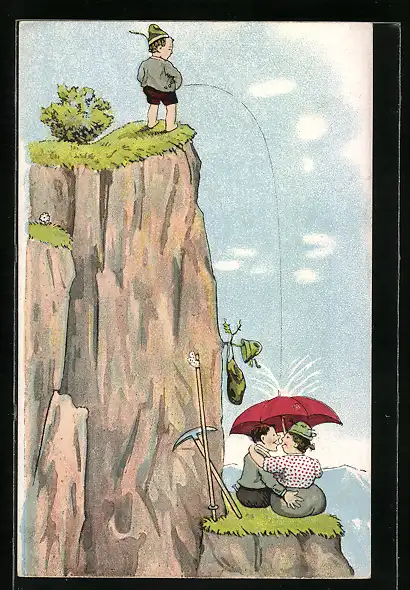 Künstler-AK Frecher Bube pinkelt von einem Berg auf Bergsteiger herab