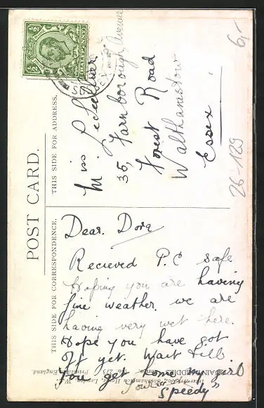 Personenbezogene Daten auf der Rückseite der Karte wurden durch blauen Textmarker unkenntlich gemacht. Die blauen Stellen sind auf die Vorderseite durchgeweicht und wirken sich negativ auf das Postkartenfoto aus