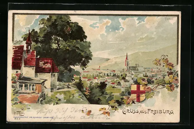 Künstler-AK Freiburg, Ortsansicht bei Tag, Eichenblätter, Wappen