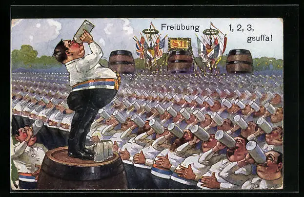 Künstler-AK Freiübung 1,2,3, gsuffa!, Trinkerhumor