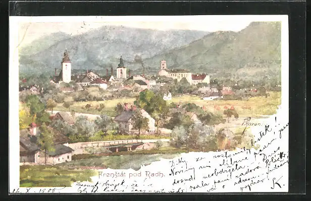 Künstler-AK Frensát pod Radh., Celkovy pohled, Kostel