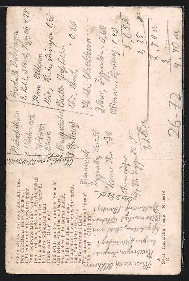 Personenbezogene Daten auf der Rückseite der Karte wurden durch blauen Textmarker unkenntlich gemacht. Die blauen Stellen sind auf die Vorderseite durchgeweicht und wirken sich negativ auf das Postkartenfoto aus
