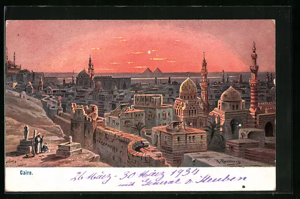 Künstler-AK Friedrich Perlberg: Kairo aus der Vogelschau, Blick zu den Pyramiden