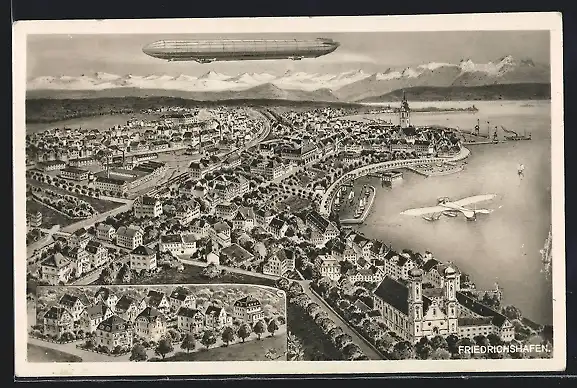 Künstler-AK Friedrichshafen, Zeppelin über dem Ort